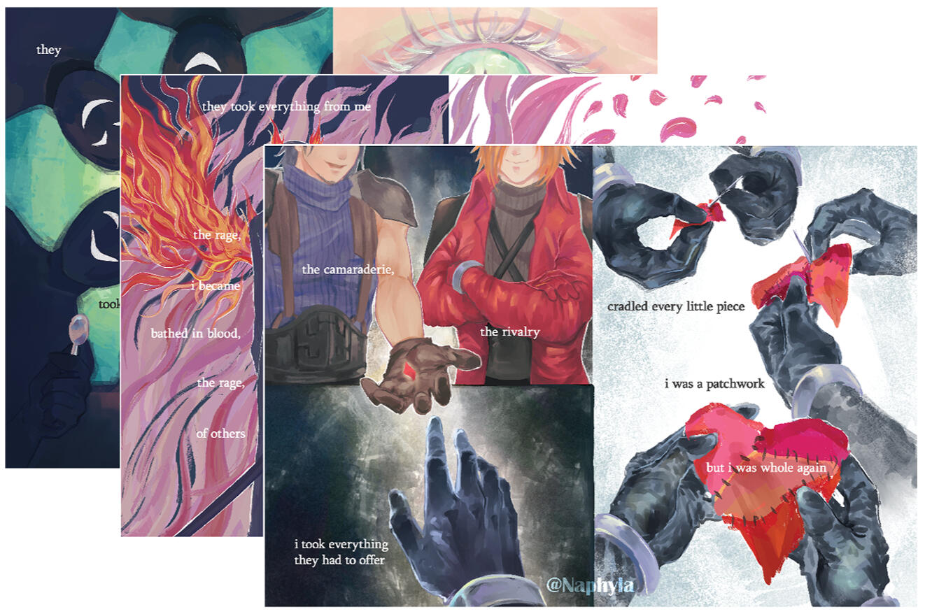 Hello! I'm Naphyla, a hobby artist who enjoys exploring narrative imageries and expanding my colour vocabulary!You can find a sample of my illustrations / art below